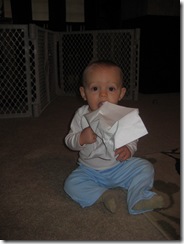 This is what Owen decided to do with the 8 month photo shoot paper. We only got 1 good shot with it before he crumpled, ate, and destroyed it.